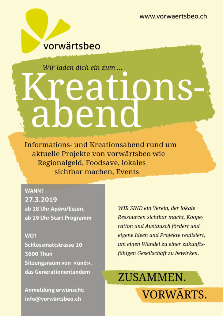 Informations- und Kreationsabend rund um aktuelle Projekte von vorwärtsbeo wie Regionalgeld, Foodsave, lokales sichtbar machen, Events